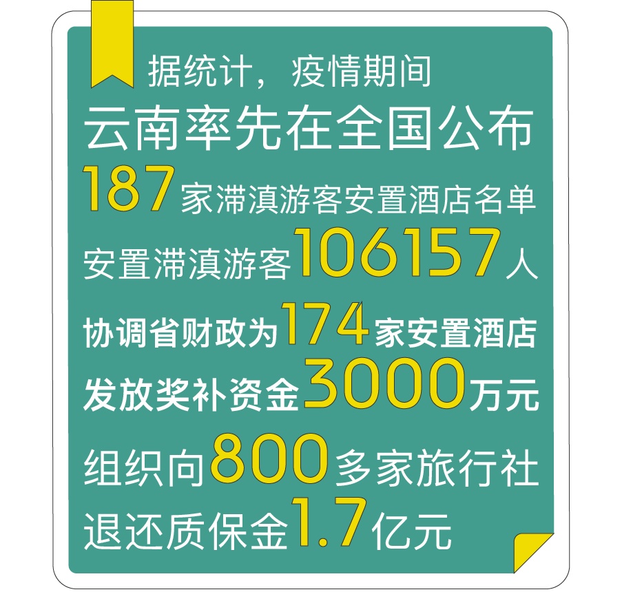 新冠疫情突如其来,大量游客被迫滞留云南各地。在省委省政府应对疫情工作领导小组统筹领导下,全省16个州市的文旅部门迅速集结行动,在当地党委、政府指挥部的统筹下与卫健、公安等部门上下联动、通力协作,摸清滞留游客数量,并悉数找到他们,一一安置在指定酒店。16个州(市)调集大量人力物力,做好集中安置和防控,安置游客中没有出现交叉感染的情况。