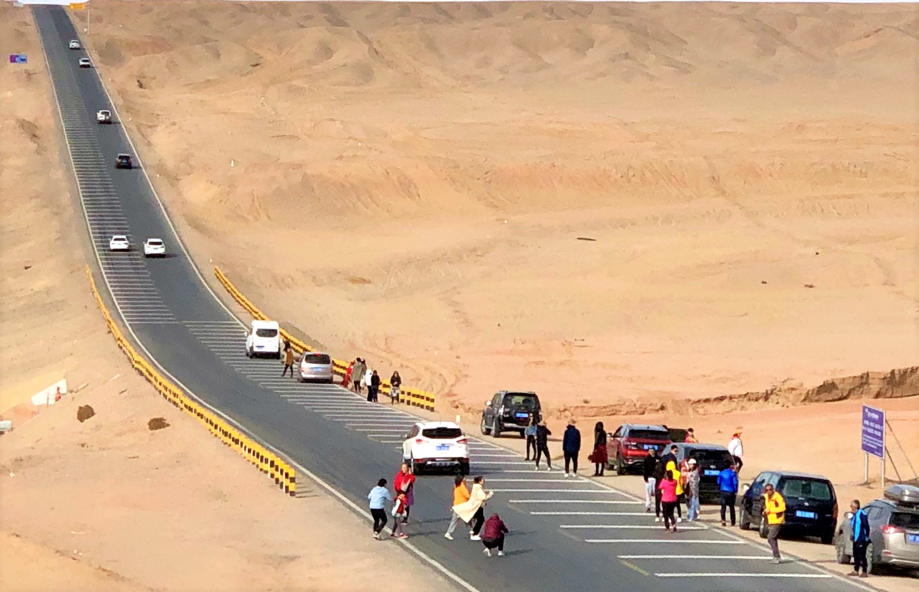 尤其多段U型沙漠公路聚集了众多自驾游客,不少情侣挥动彩色纱巾在此合影留念。