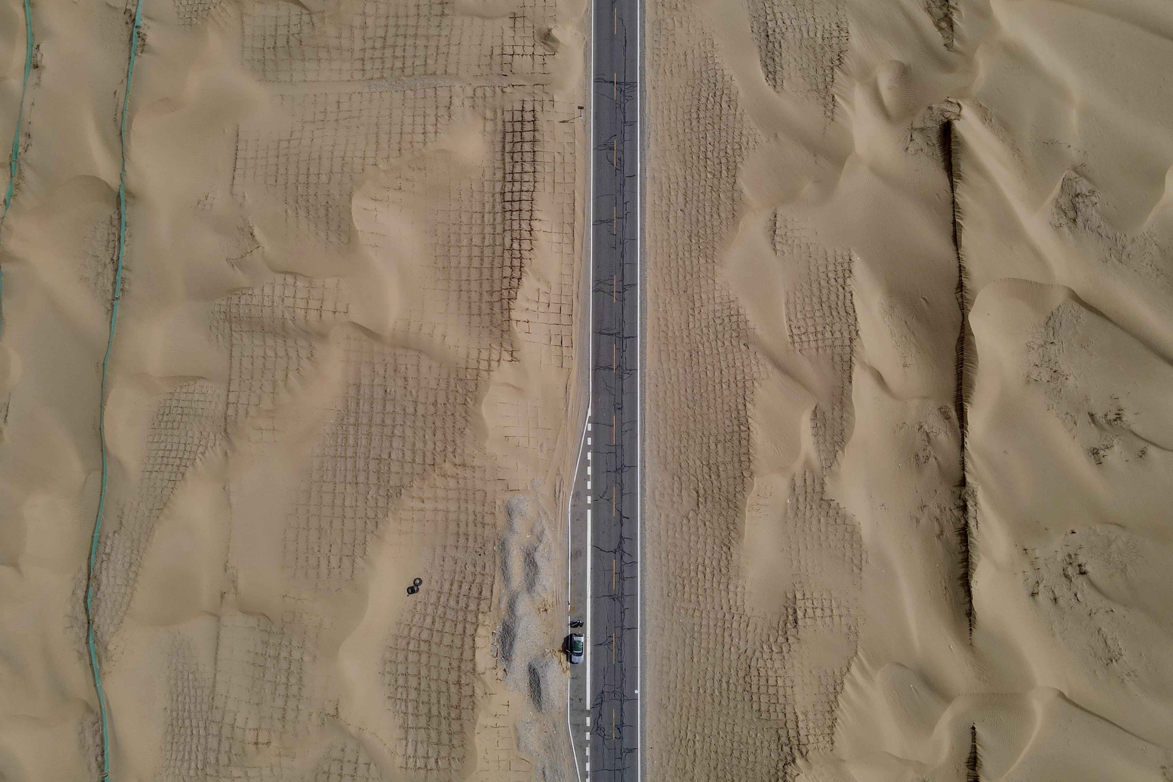 较之1995年修建,世界流动沙漠最长等级公路的民丰至轮台沙漠公路,且末至塔中沙漠公路修建时间要晚得多,主要供油田使用,沿途人车稀少。两侧除简单的防沙网带,没有任何植树保护带。