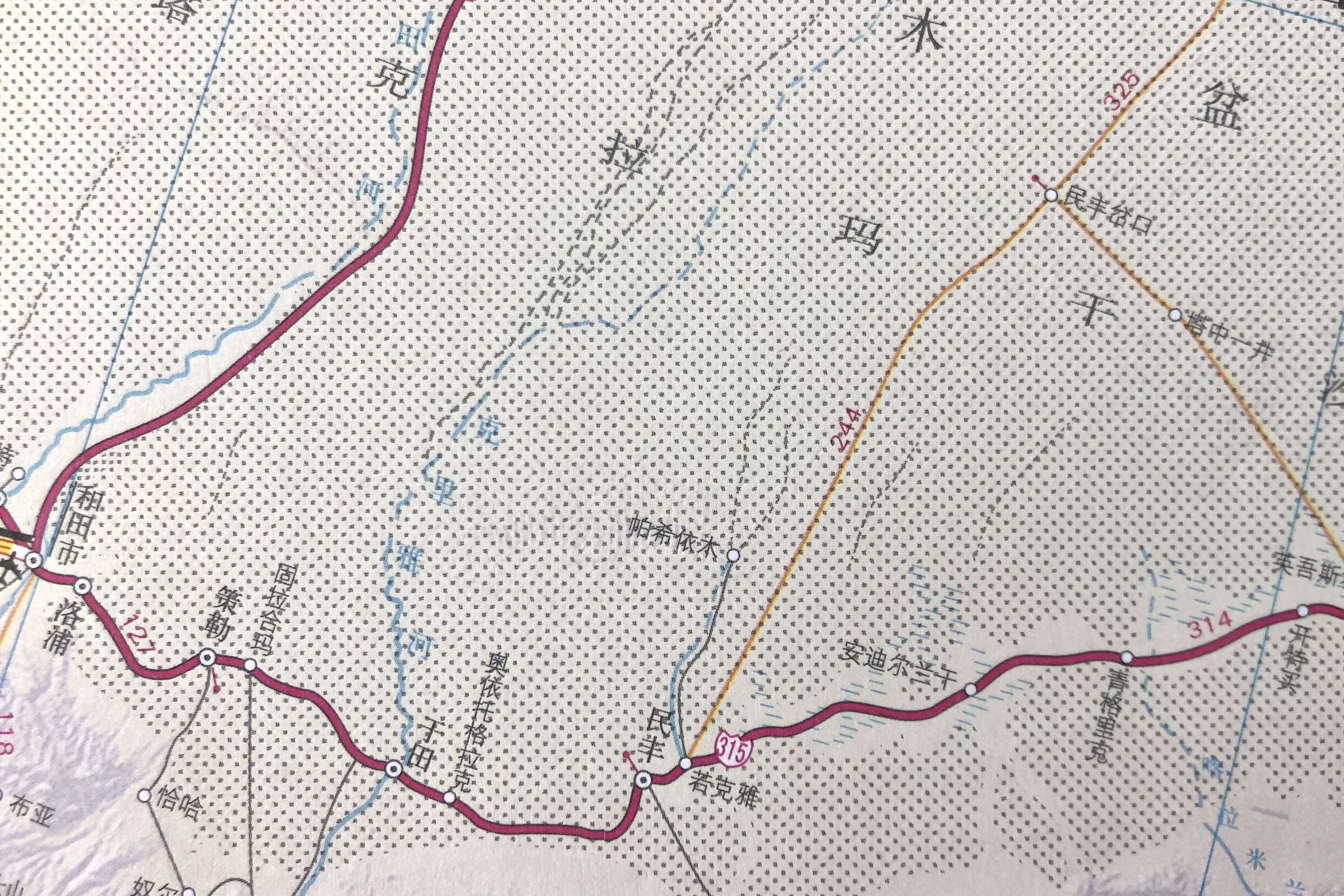 到塔海油田,向北经轮台可前往北疆,向南折还至民丰即回返315继续西去叶城和喀什。