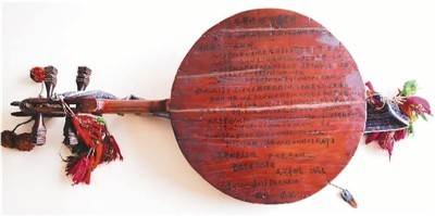 伴随阿家文时间最长的四弦琴,琴板背面记录着他的演艺经历。 李曼丽摄