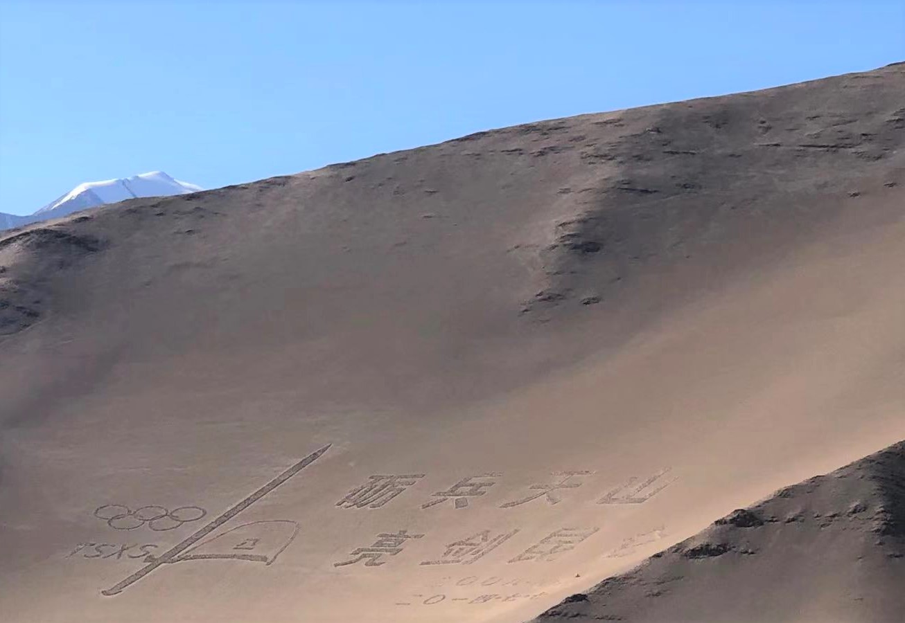 这一线曾是中印惨烈争夺的西段战场。绵延的高原雪峰下,“弘扬喇啦昆仑精神、砺兵天山、亮剑昆仑”山坡上堆垒着巨大的标语和图案。
