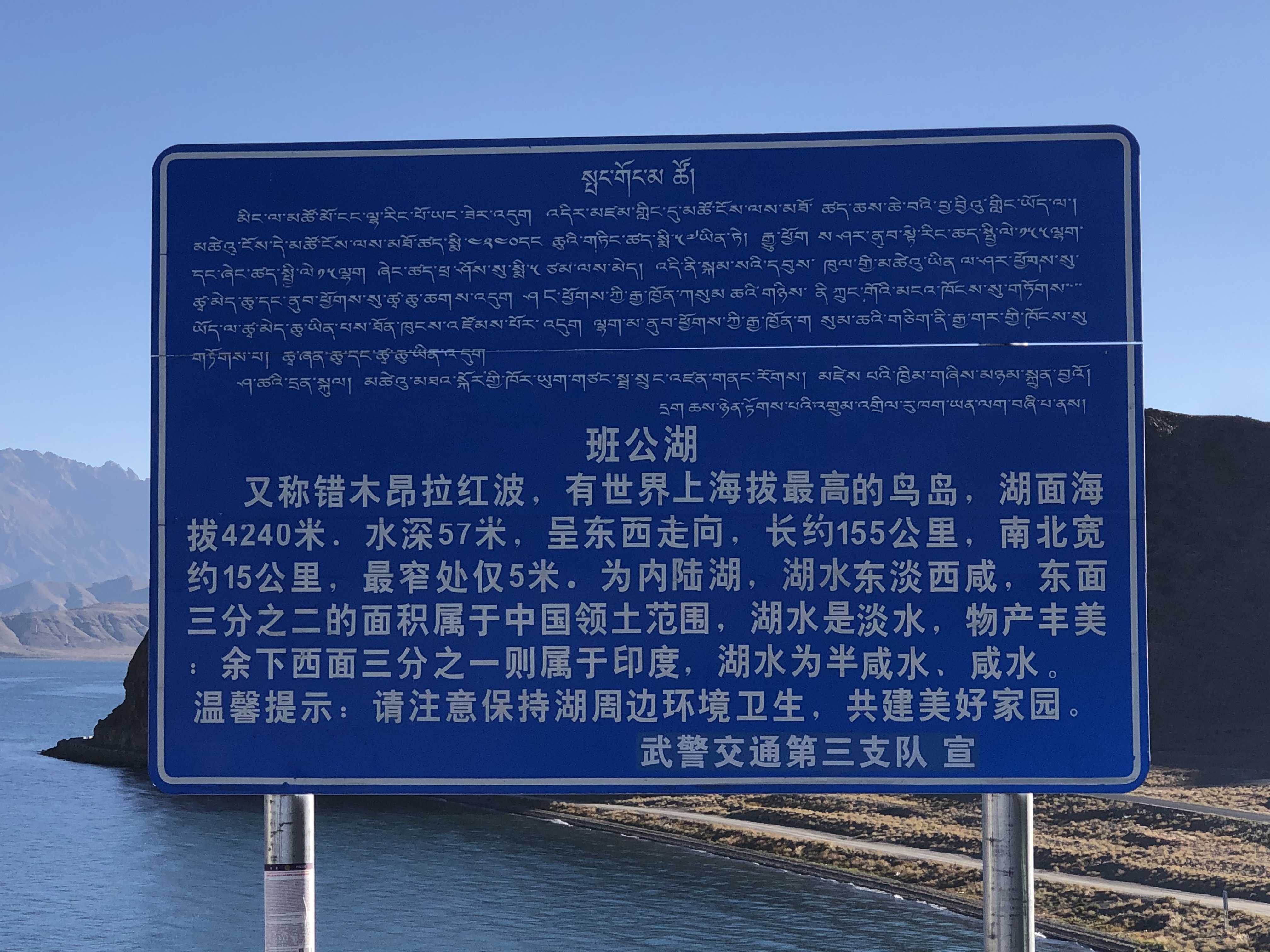 10多公里后,班公湖到了。这个神奇而漂亮的高原湖泊湖水东淡西咸,而淡水部分湖面属于中国,约占三分之二面积,咸水的西部属于印控克什米尔。