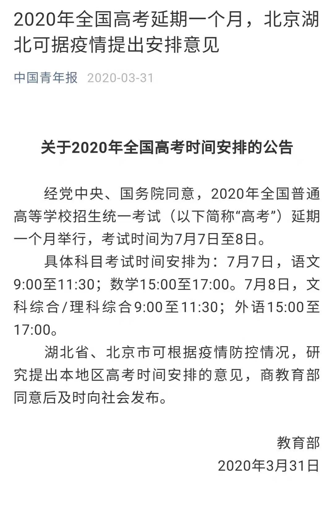 今年的高考时间公布后,不少人想起去年高考延期一个月到7月的场景。