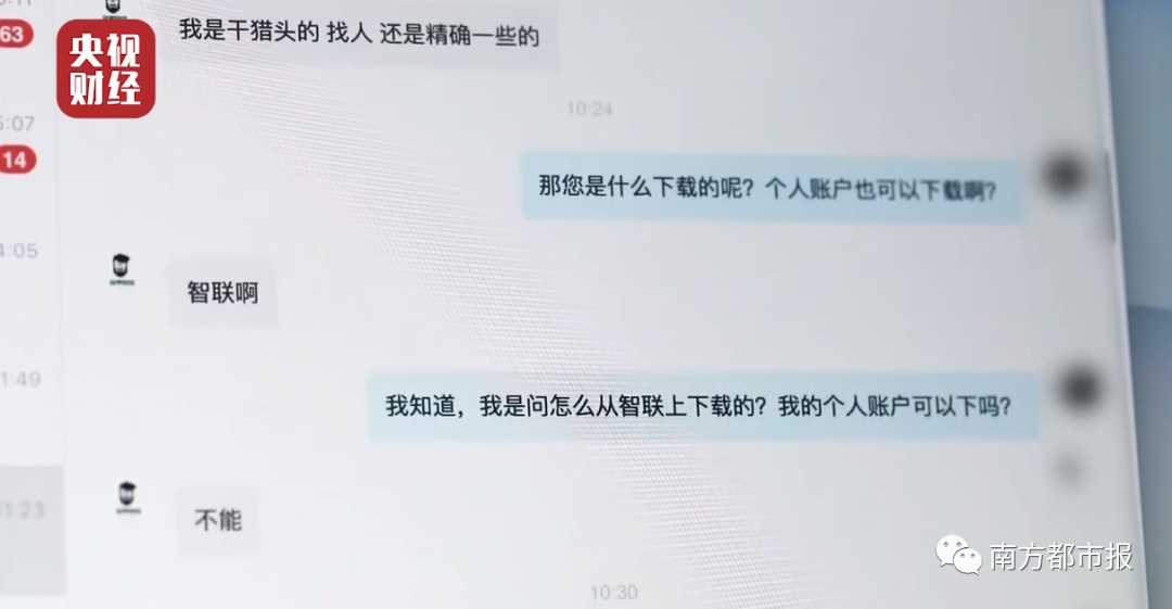记者发现,前程无忧和猎聘网上,企业账户只需支付费用,便可以下载到求职者的完整简历,对企业账户同样存在管理漏洞。