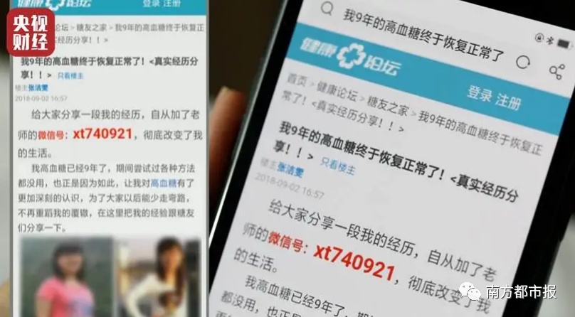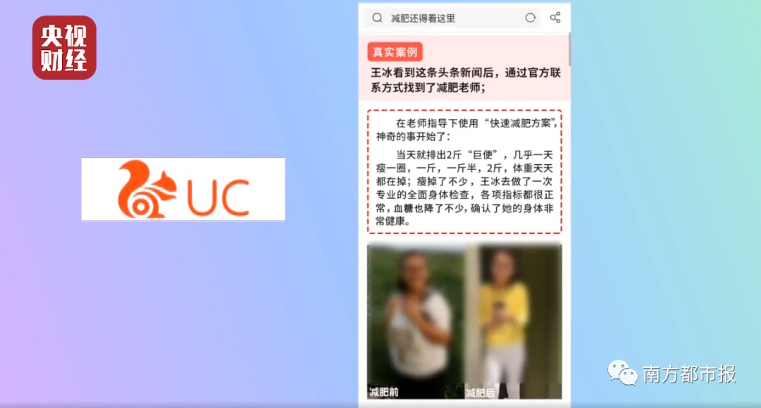 记者在UC浏览器上搜索“减肥”“降血糖”等关键词,搜索结果的前几条都是网友分享治好疾病经历,下方标注着广告字样。广告里网友自称,自从认识某老师,按照老师给的方子,血糖恢复稳定,胰岛素都停用了。文章中多次醒目标红老师的微信号。记者微信添加了这位老师,对方简单询问过病情后,就向记者推荐“白背三七诺丽果粉”。(相关报道链接:【3·15晚会】第四弹:揭秘360搜索、UC浏览器医药广告造假链条)