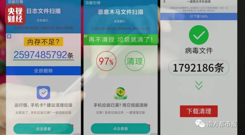 70多岁的李女士通过智能手机看新闻、小说时,手机屏幕总会自动蹦出一些“安全提示”:“病毒”“垃圾”“内存严重不足”,按照提示李女士清理了手机,但她发现这些“安全提示”越清理越多,手机越用越慢。(相关报道链接:【3·15晚会】第三弹:手机清理类软件将老人推向诈骗深渊)