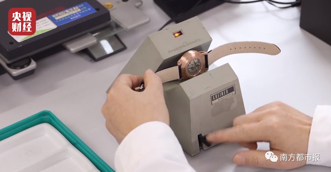 手表受磁是机械表常见的故障,直观体现就是走时不准。国家钟表质量监督检验中心的工程师告诉记者:“受磁手表正常维修只需要消磁仪进行退磁就可以”,通常耗时仅一两分钟。(相关报道链接:【3·15晚会】第七弹:手表原封不动躺一夜,几千维修费就到手)