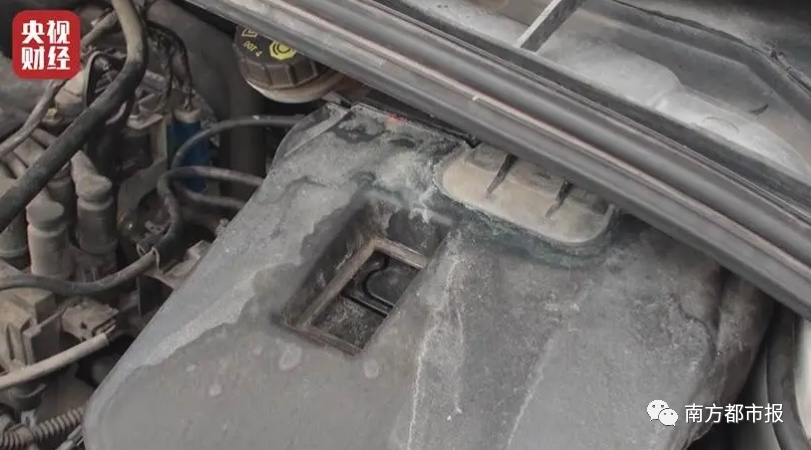 在记者的不断追问下,维修人员称,集雨板有一个洞,如果不堵的话,水会从这里往下滴,会滴在变速箱和发动机对接的地方。4S店让车主自费维修变速箱的同时,悄悄补上了集雨板上的漏点。
