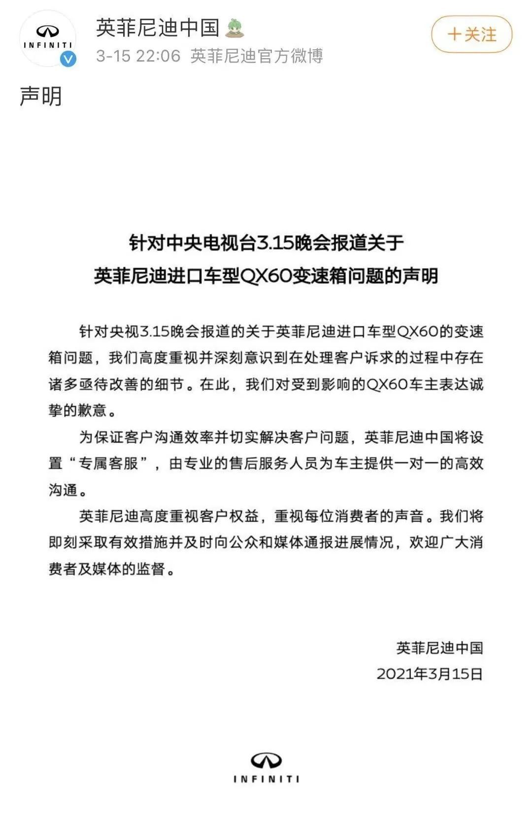 3月15日晚,英菲尼迪官方微博就央视3·15晚会报道的英菲尼迪变速箱故障频发,英菲尼迪4S店要求车主签不平等协议问题发表了官方声明,对受到影响的QX60车主致歉,并表示英菲尼迪中国将设置“专属客服”,由专业的售后服务人员为车主提供一对一的高效沟通。