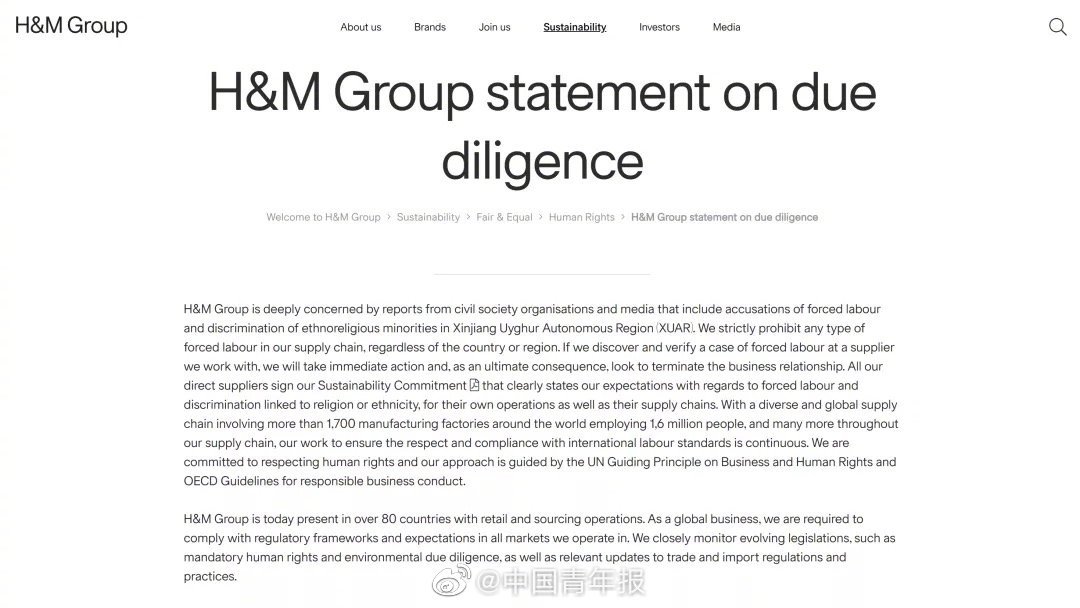 记者查询发现,这份声明写道:H&M集团对来自民间社会组织的报告和媒体的报道深表关注,其中包括对新疆维吾尔自治区少数民族强迫劳动和宗教歧视的指控。(H&M Group is deeply concerned by reports from civil society organisations and media that include accusations of forced labour and discrimination of ethnoreligious minorities in Xinjiang Uyghur Autonomous Region (XUAR).)