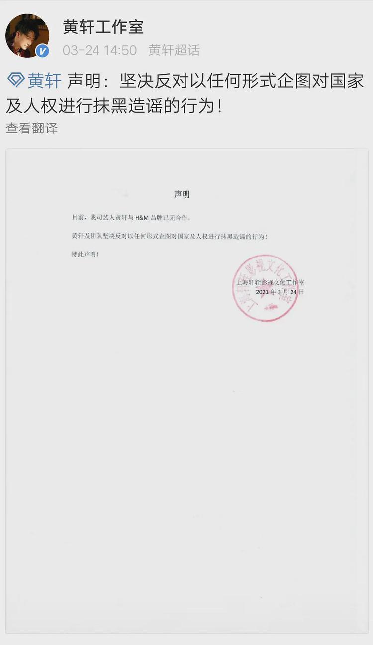 3月24日下午,黄轩工作室发布声明,称与H&M品牌已无合作,并表示“坚决反对以任何形式企图对国家及人权进行抹黑造谣的行为!”去年,H&M官宣黄轩为该品牌大中华区男装代言人。