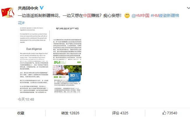 3月24日上午,共青团中央在官博对此事发声:一边造谣抵制新疆棉花,一边又想在中国赚钱?痴心妄想!