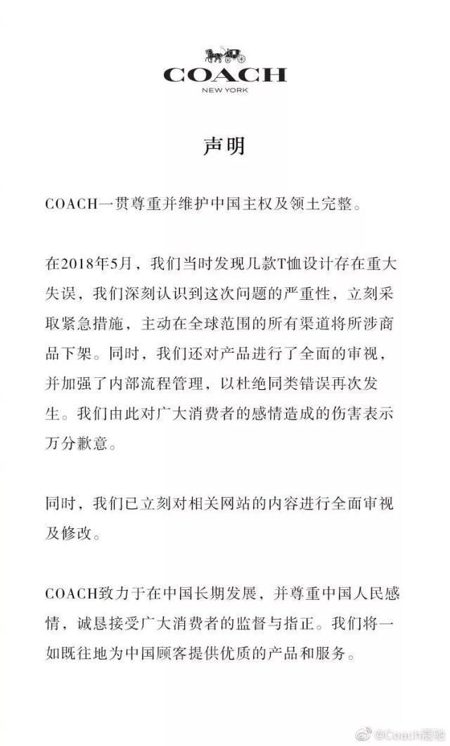 随后,蔻驰、纪梵希、亚瑟士、CK、馥蕾诗这几家品牌也纷纷被社交媒体曝光,它们或在服装设计,或在官网备注信息上存在不尊重中国国家主权的现象。与被点名品牌有合作的刘雯、易烊千玺等明星立刻发声,加入到了解约的队伍中。为挽回损失,这几个品牌急忙发布道歉声明。