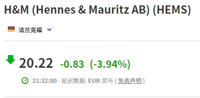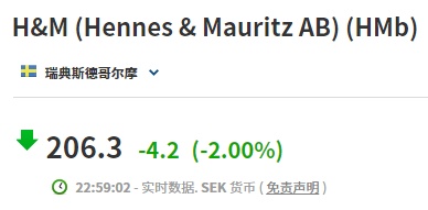 不过,截至发稿,H&M在瑞典股票市场跌2%;在德国法兰克福股票市场跌近4%;在英国伦敦股票市场跌2%;在美国股票市场跌1.45%