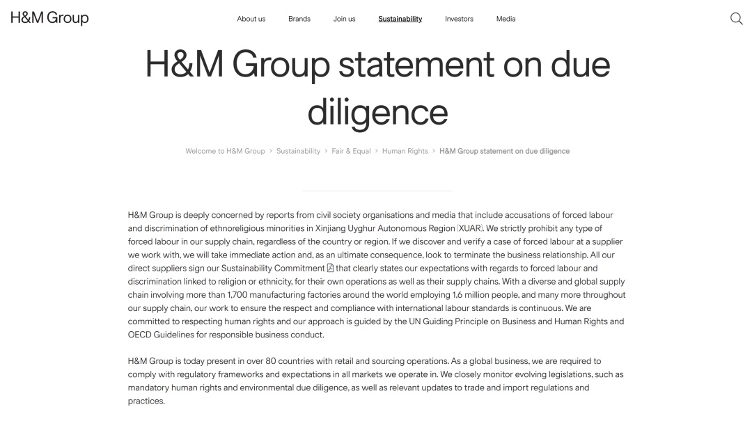 这份声明写道:H&M集团对来自民间社会组织的报告和媒体的报道深表关注,其中包括对新疆维吾尔自治区少数民族强迫劳动和宗教歧视的指控。