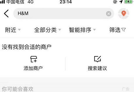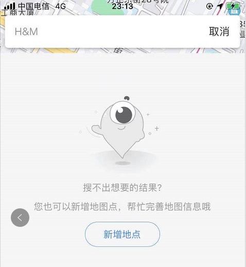 百度地图APP搜索HM显示,搜不到结果,搜索H&M也未显示HM相关门店位置。