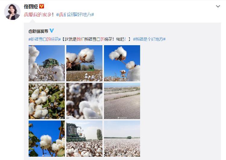 3月24日晚,演员佟丽娅转发了@新疆发布 关于新疆棉花的微博,佟丽娅转发时写到,“我爱我的家乡”,她同时加上了#我们新疆好地方#的话题标签。