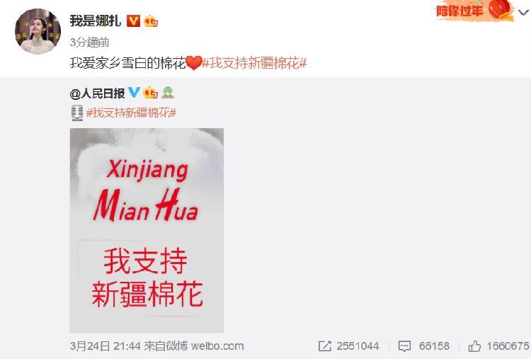 3月25日上午,演员古力娜扎也转发了@人民日报关于支持新疆棉花的微博,古力娜扎转发时写到,“我爱家乡雪白的棉花”。