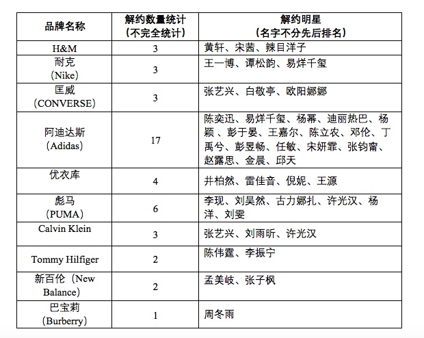 根据已公开的信息来看,阿迪达斯目前为收到明星解约公告最多的品牌,据记者不完全统计,目前已有17位明星宣布解除合作。
