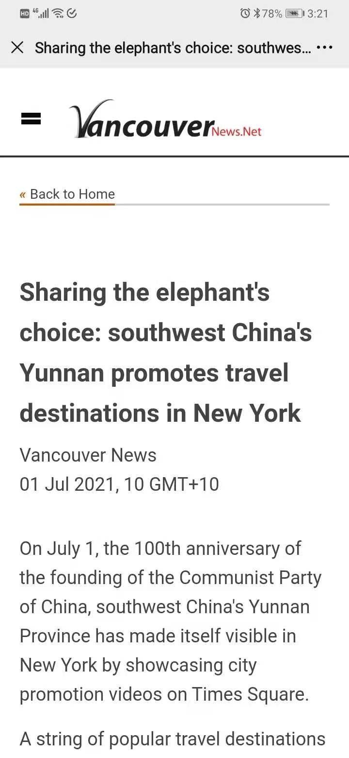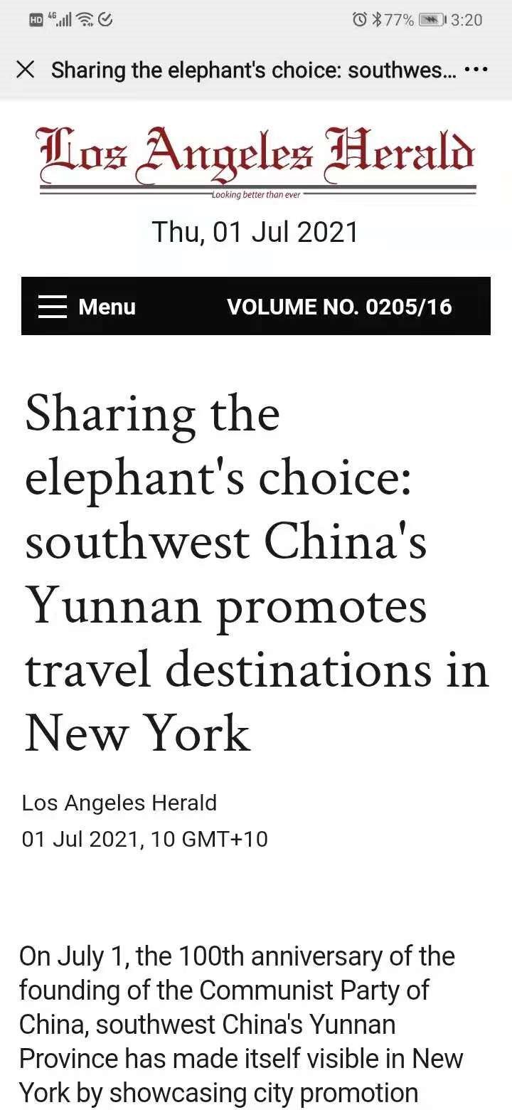 7月1日,在中国共产党建党100周年之际,一组来自中国云南的城市形象宣传片集体亮相美国纽约时报广场“中国屏”。美国新闻报、美国新闻网、洛杉矶先驱报等十余家美国媒体对此进行了报道。