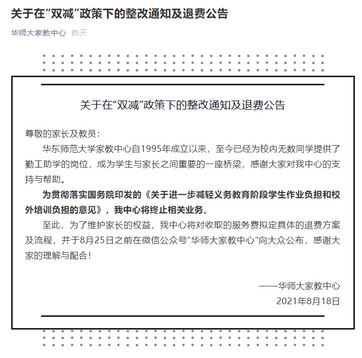 18日,华师大家教中心发布关于在“双减”政策下的整改通知及退费公告,内容如下: