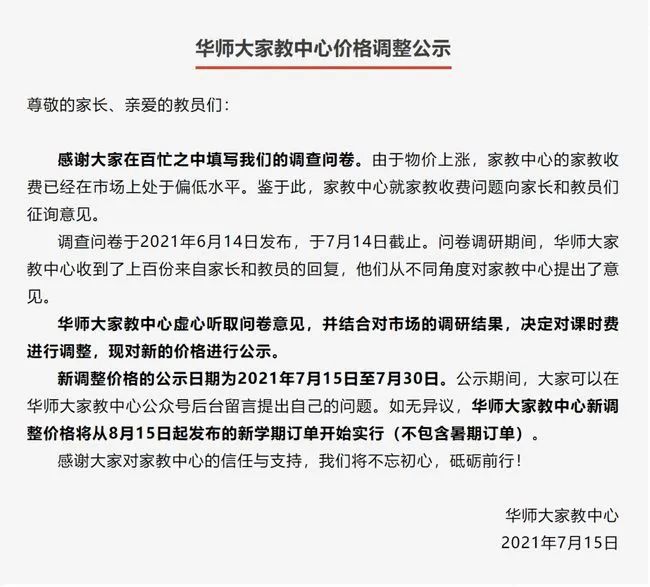 在今年7月份,家教中心才刚刚调整过价格。