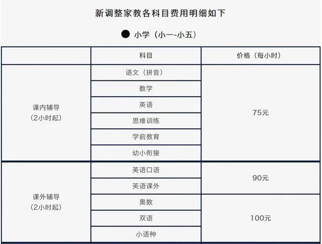 公示显示,小学阶段语文(拼音)、数学、英语、思维训练、学前教育、幼小衔接课内辅导价格为75元每小时;英语口语、英语课外、奥数、双语、小语种等课外辅导价格为90元至100元每小时;美术、乐器、声乐、游泳等特长辅导价格为105元至185元每小时;计算机、编程、软件等技能辅导为110元至150元每小时;此外,小学阶段还提供心理辅导、二年级以下陪读陪玩辅导内容。