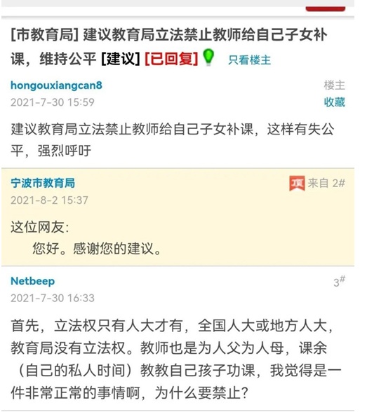 截图显示,宁波市教育局也对此进行了回复:“这位网友:您好。感谢您的建议。”