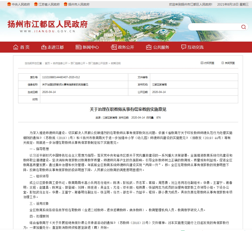 事实上,这项规定并非新规,早在2020年4月,扬州市江都区教育局就公布了《关于治理在职教师从事有偿家教的实施意见》,其中确实有上述规定,目前,该份《意见》在江都区人民政府官方网站仍然有显示。