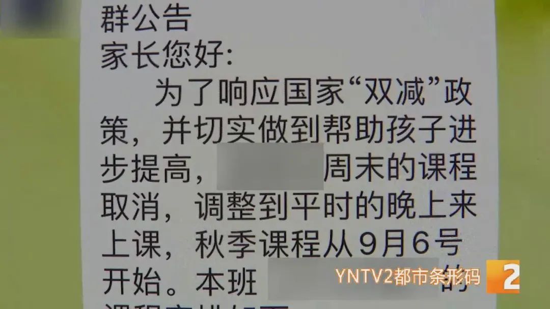 杨女士的女儿今年读小学六年级,今年暑假,考虑到孩子即将升初中,为了进一步夯实基础,杨女士为女儿报了语数培训班,原计划语数的上课时间是周日上午。但上周,杨女士接到培训学校的通知:为了响应国家双减政策,原定周末的课程取消,调整到每周二三晚上上课,时间从晚上6点50至8点半。