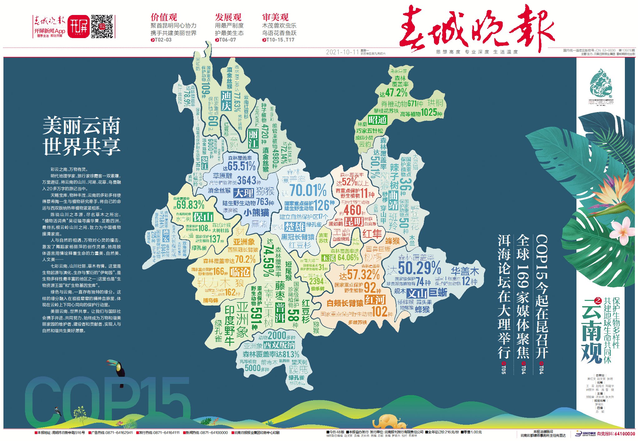10月11日,《生物多样性公约》缔约方大会第十五次会议(COP15)第一阶段会议将在云南昆明召开。春城晚报推出48版的《美丽云南 世界共享》特刊,从价值观、发展观、全球观、审美观、实践观等多个维度为大家呈现云南的“绿色脉动”。
