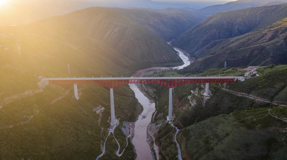 红色钢桁梁飞架在灰白的桥墩上,远处望去,跨越元江的中老铁路元江特大桥在群山间显得格外壮美。