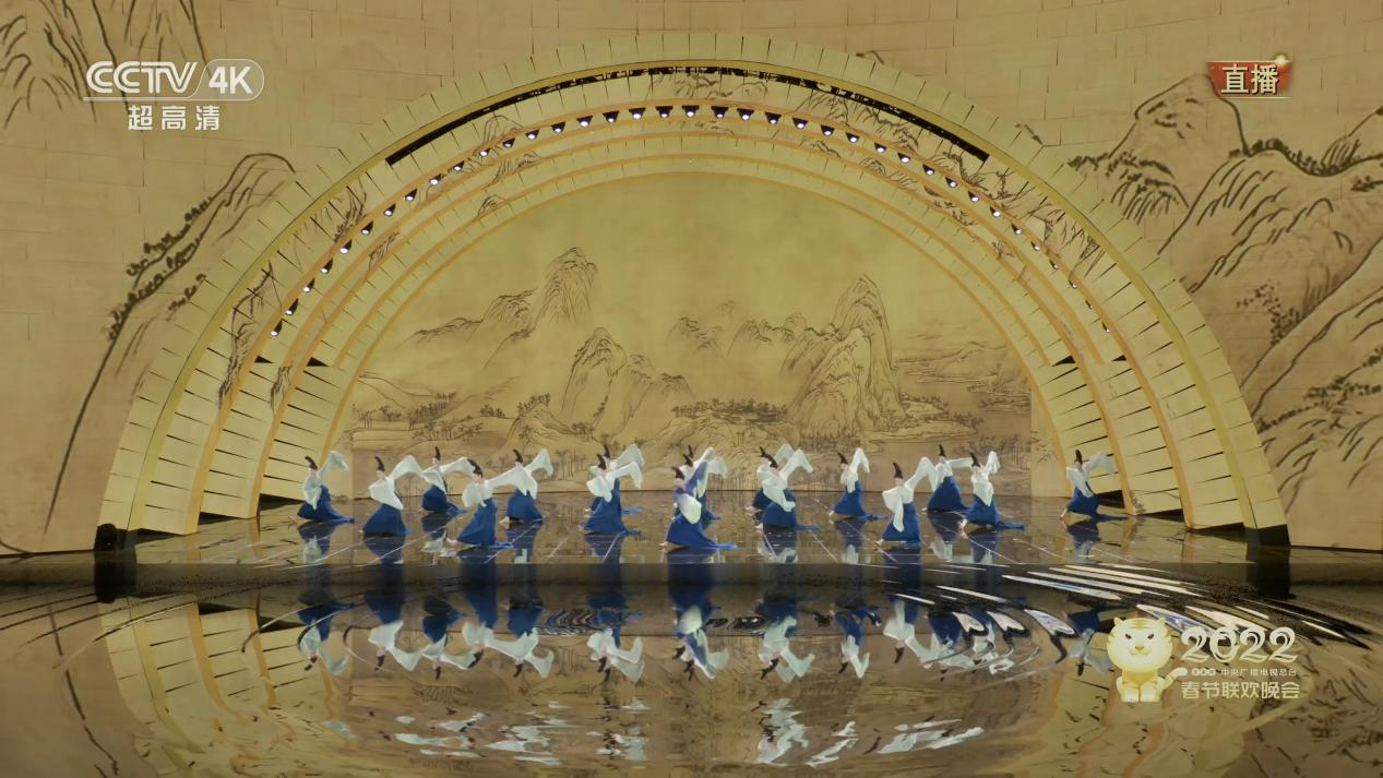 中国传统乐器的声音刚柔并济,袅袅余音环绕,《只此青绿》在春晚古朴大气的舞台背景映衬下,与《千里江山图》跨越古今对话,将中华传统之美娓娓道来。