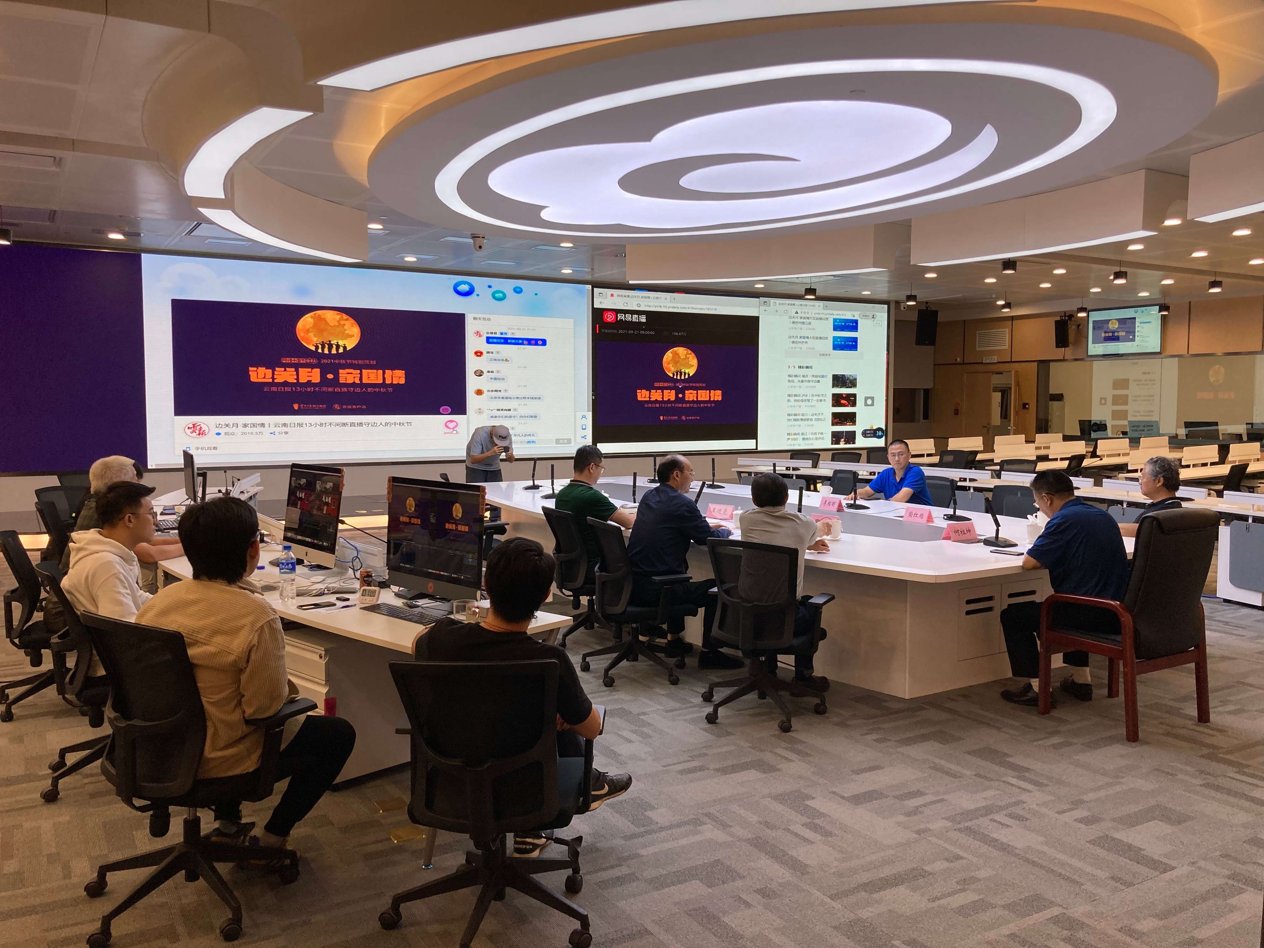 2021年中秋,云报集团以全媒体融合报道的理念,深入践行“四力”的要求,提出“边关月 家国情”总策划,围绕“筑牢铜墙铁壁 守护好神圣国土”“守好我的一公里”“镇守边关、视死如归”“民族团结进步”“强边固防 守好国门 守好家园”几个主题,统筹调度“报、刊、网、端、微、号、屏”协同联动报道。图为云报集团全媒体指挥中心协同调度现场。