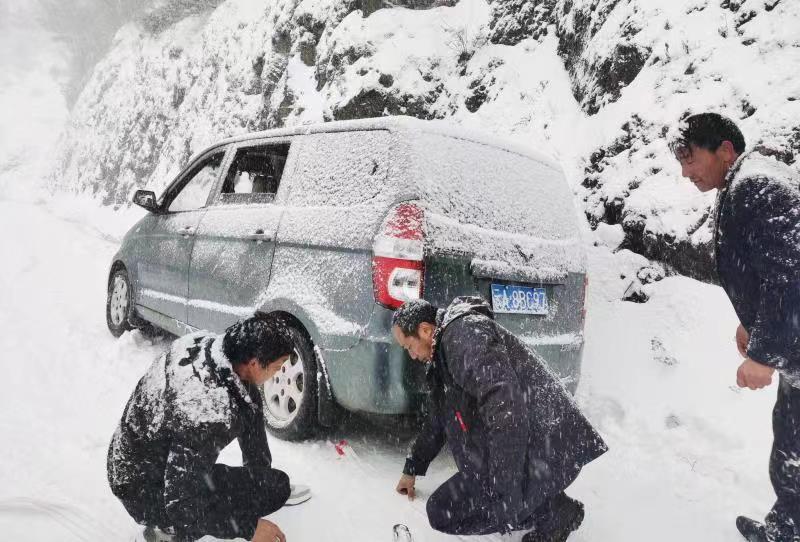 新春走基层采访途中,云南日报记者黄兴能(中)在风雪中救助被困车辆现场。