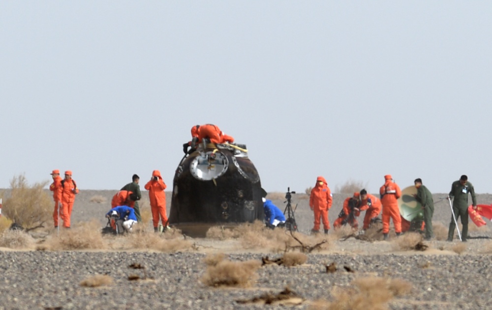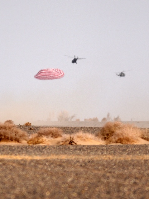 ↑4月16日,神舟十三号载人飞船返回舱在东风着陆场预定区域成功着陆。新华社记者 任军川 摄