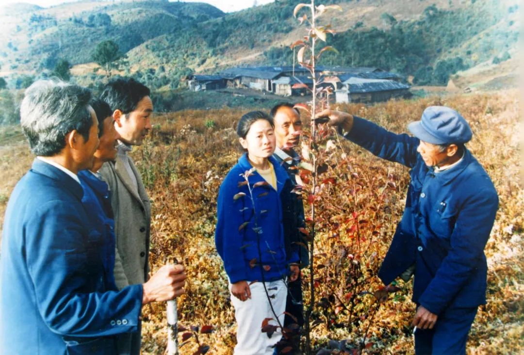 杨善洲(右一)在大亮山给青年职工做嫁接示范