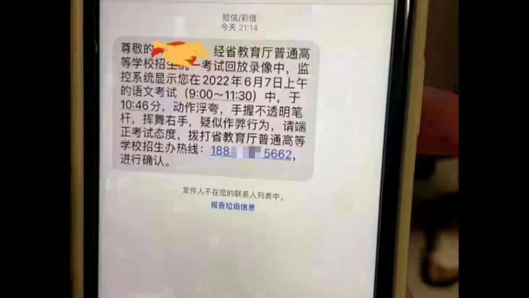 近日,有考生家长收到以省教育厅普通高等学校招生办名义发出的短信,称考生在高考中动作浮夸,疑似作弊。在短信的开头,准确写出了考生姓名,短信的结尾还要求考生主动拨打电话进行确认。