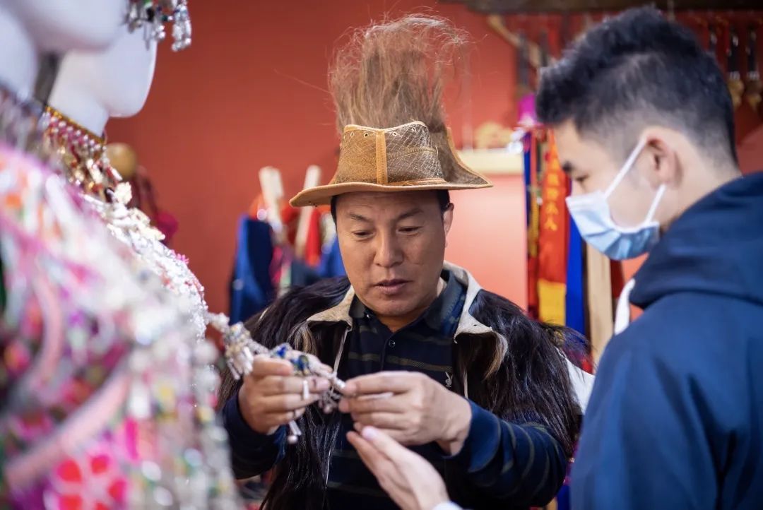 字汝民(左)正在向游客介绍民族服饰。徐俊 摄