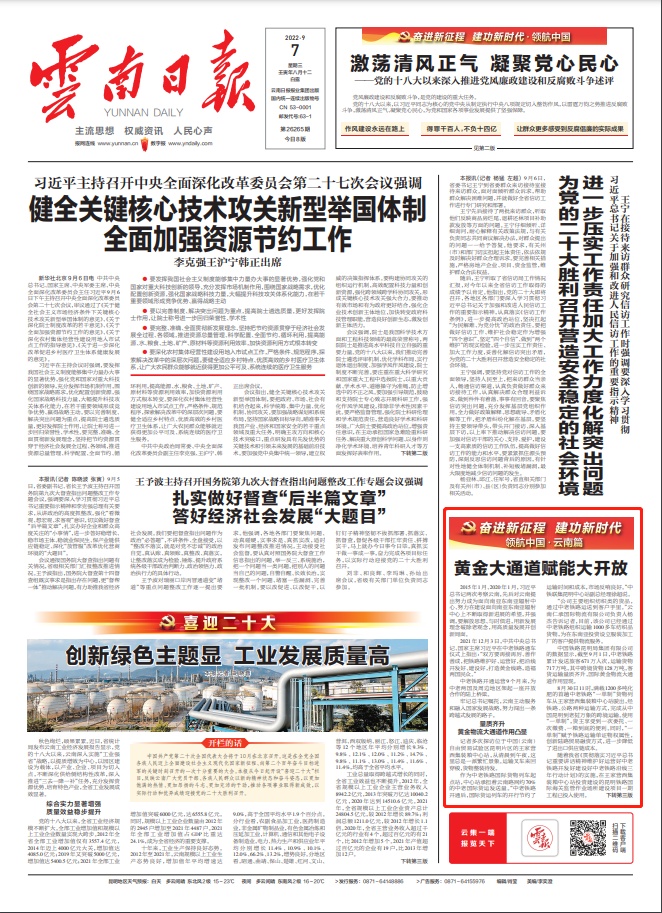 9月7日,云南日报头版刊发“领航中国•云南篇”专题文章《黄金大通道赋能大开放》,聚焦云南牢记总书记嘱托,主动服务和融入国家发展战略,努力闯出一条跨越式发展的路子。