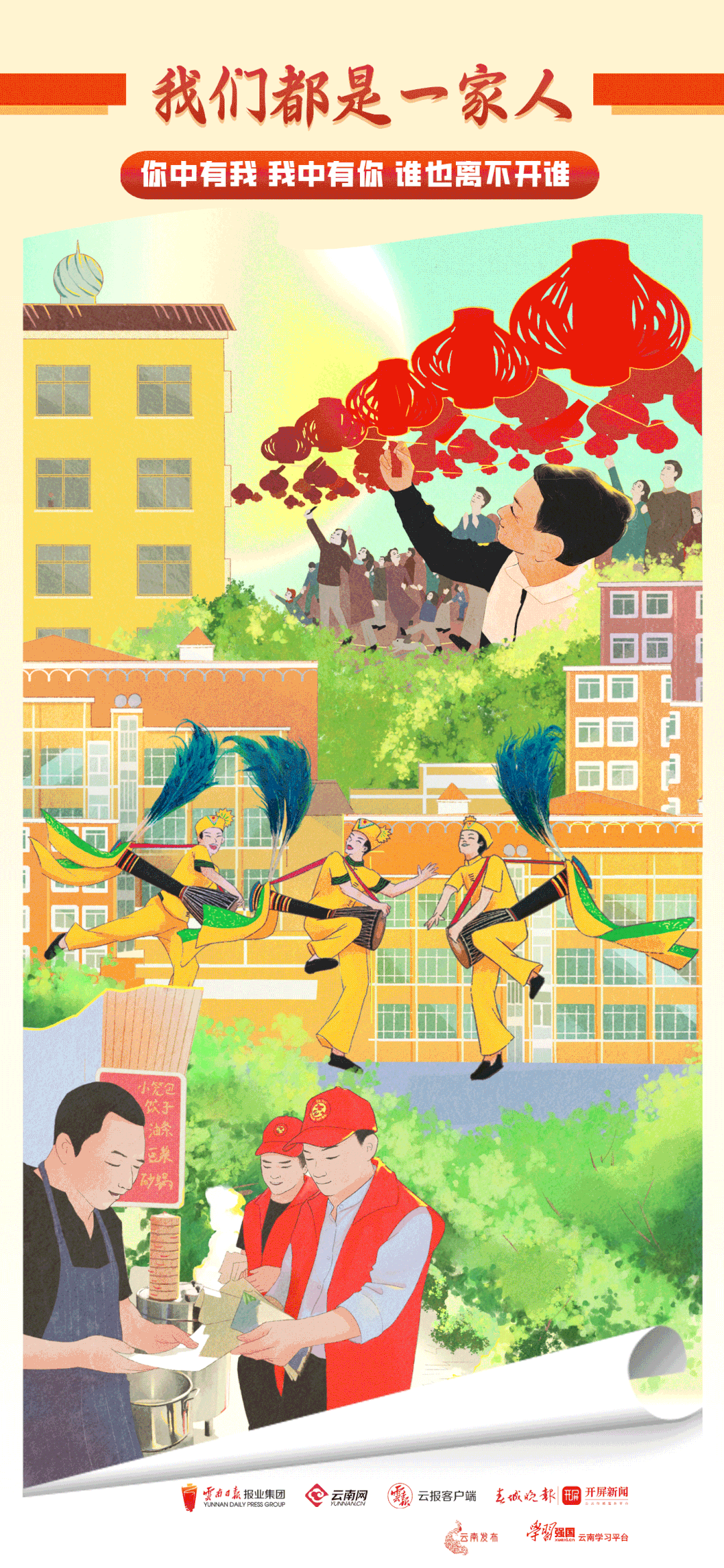 为迎接党的二十大胜利召开,9月6日,由云南省民族宗教事务委员会、云南日报报业集团主办,云南网、云南发布、“学习强国”云南学习平台联合推出的“我们都是一家人 建设民族团结进步示范区”新时代民族团结网络宣传活动正式启动。活动精选云南16州市的民族团结进步精品案例,通过精美的手绘海报和生动的文字语言,展现党的十八大以来,云南以铸牢中华民族共同体意识为主线,奋力开创民族团结进步事业新局面,让民族团结之花在云岭大地常开长盛。