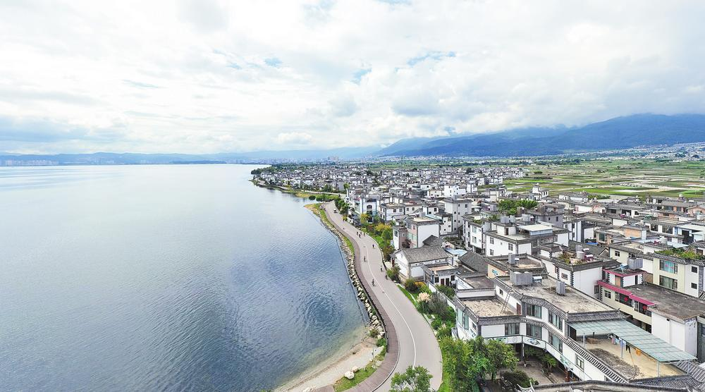 沿着脚下的洱海生态廊道缓步前行,一边是白族传统民居,一边是洱海。