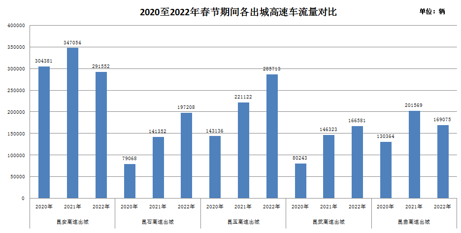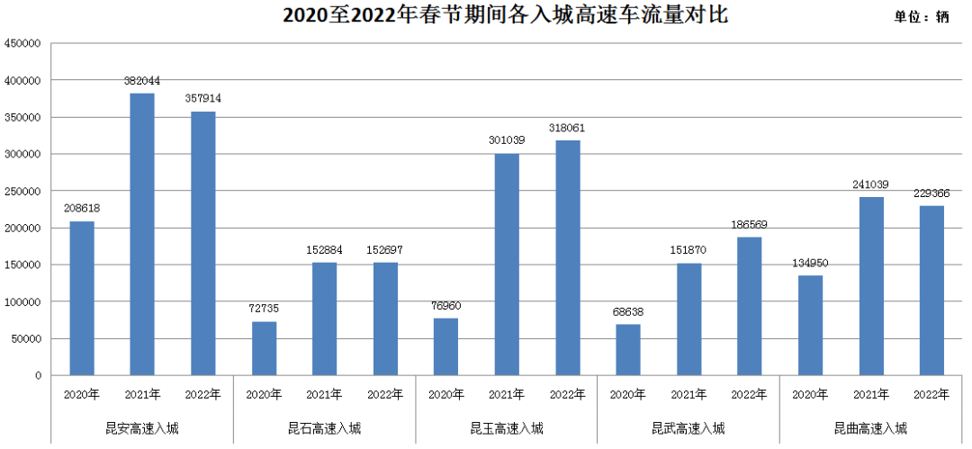 从近3年5条主要出入昆高速公路春节期间进出昆车流量对比情况看,去年春节期间,除昆玉和昆武高速入城车流量有所上升外,昆安、昆石、昆曲高速入城车流量均不同程度下降;昆石、昆玉、昆武高速出城车流量小幅度上升,昆安和昆曲高速出城车流量下降。预计今年春节期间各条高速公路进出昆车流量较2022年将有所上升(因新昆楚高速无相关流量数据,故未纳入分析研判)。