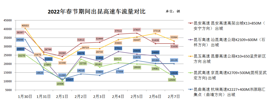 从2022年春节各条高速公路每日出昆车流量来看,出昆车流量在1月30日(节前一天)达到最高峰后逐步下降,2月6日(假期最后一天)达到高峰后下降。其中,部分高速在假期期间有短暂的出行小高峰后再次下降。