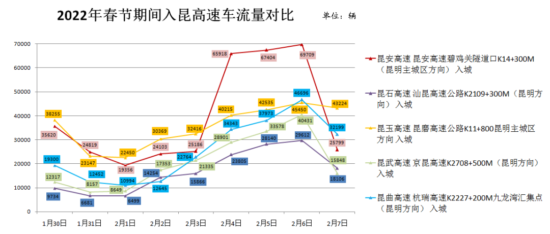 结合今年疫情形势、出行政策和往年春节假期各条高速公路通行情况,预测今年春节期间进出昆车流量总体将高于2022年水平。