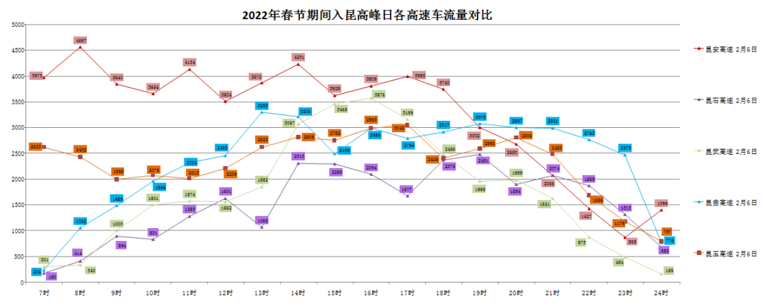 昆曲、昆石、昆武高速入昆高峰日车流量7时开始持续上升,于12时、13时、14时、16时、19时达到最高峰后有所下降并趋于平稳,21时开始逐步下降。