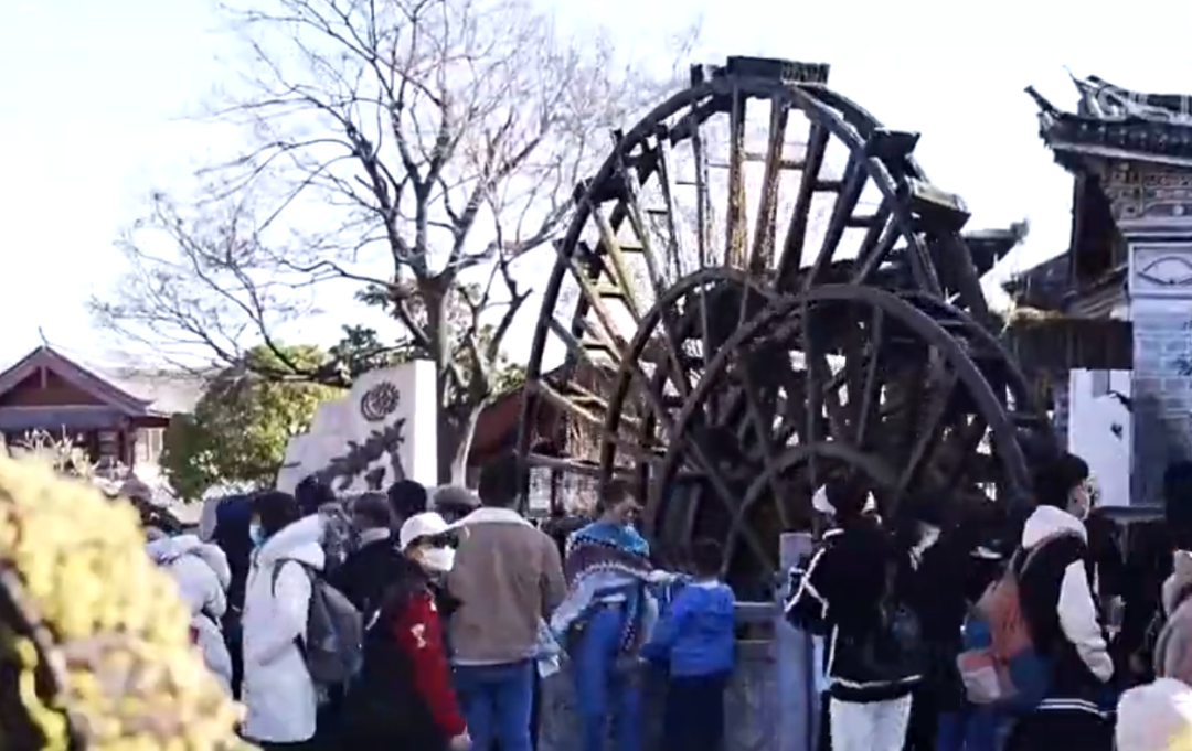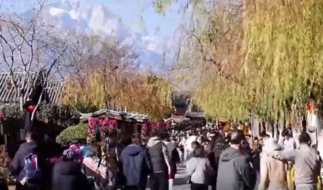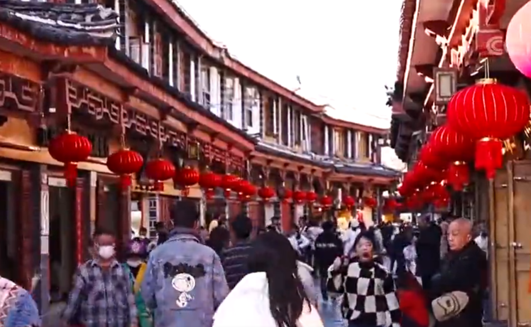 为了迎接游客,丽江古城特意做了布置,挂上灯笼、摆上鲜花,用欢快的民族歌舞欢迎八方来客。同时,丽江古城限制了核定承载量,一旦游客数量接近峰值就会采取限流、错峰等措施。