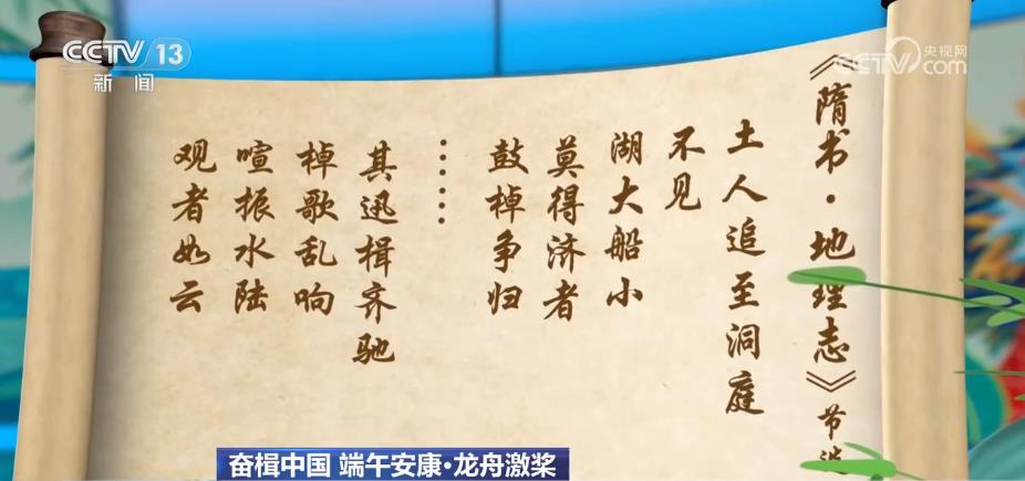 龙舟竞渡,其起源的传说之一是楚国人借龙舟纪念屈原。《隋书·地理志》记载,在屈原投江之后,“土人追至洞庭,不见。湖大船小,莫得济者,鼓棹争归……其迅楫齐驰,棹歌乱响,喧振水陆,观者如云。”