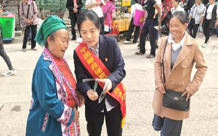 为助力推进乡村振兴,全面落实2023年“金融消费者权益保护教育宣传月”活动要求,在2023年9月26日“五进入”集中教育宣传日当天,蒙自市支行在网点开展金融知识宣传的同时,进一步扩大宣传范围,来到苗族聚居的蒙自市鸣鹫镇走进农村对广大社会公众开展广泛金融知识宣传。